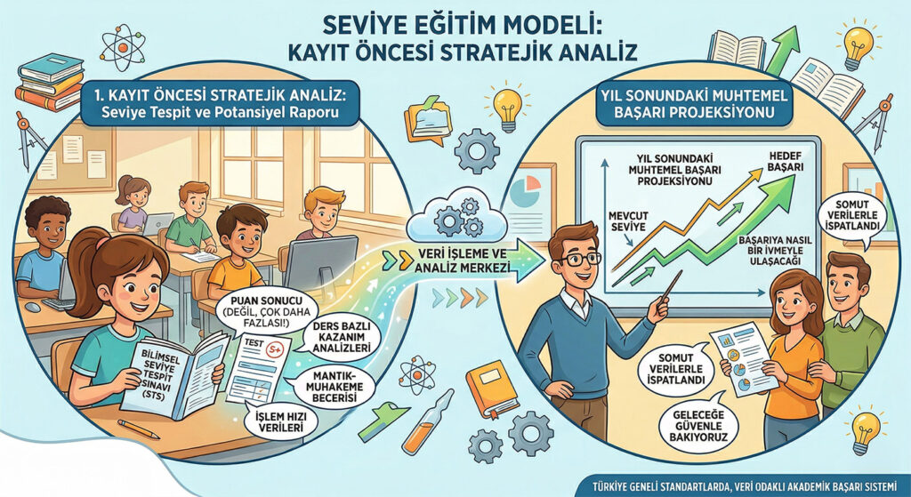 Bilimsel Seviye Tespit Sınavı (STS): Her öğrenciye kayıt öncesinde uygulanan bu sınav, sadece bir puan sonucu değil; ders bazlı kazanım analizleri, mantık-muhakeme becerisi ve işlem hızı verilerini sunar.