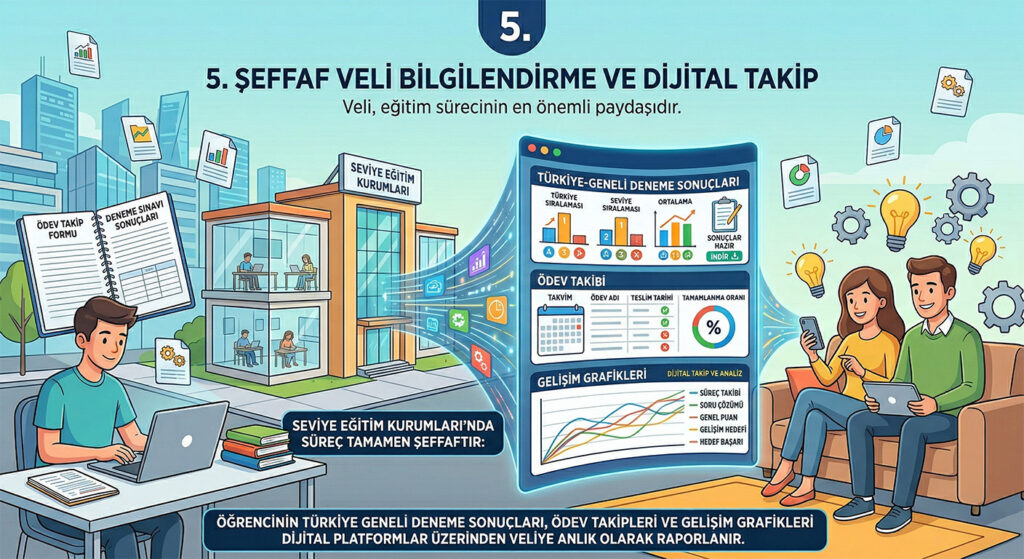 Öğrencinin Türkiye geneli deneme sonuçları, ödev takipleri ve gelişim grafikleri dijital platformlar üzerinden veliye anlık olarak raporlanır.