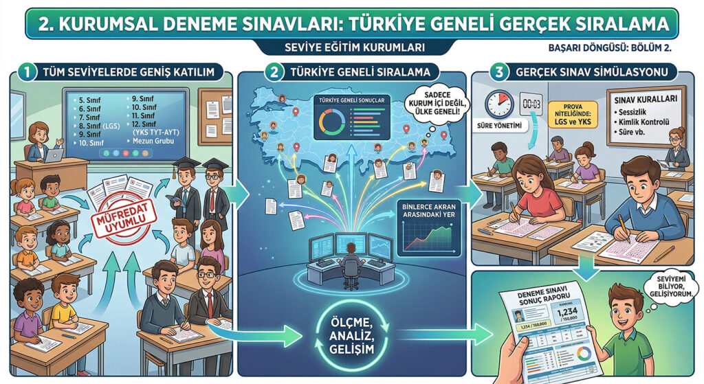 Seviye Eğitim Kurumları’nın en güçlü sütunlarından biri, tüm kademelerdeki öğrenciler için uygulanan Türkiye Geneli Kurumsal Deneme Sınavlarıdır.