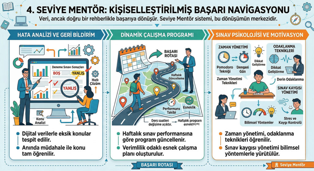 Hata Analizi ve Geri Bildirim: Deneme sınavları sonrasında mentör öğretmenler, öğrencinin "boş" ve "yanlış" bıraktığı soruların analizini yapar. Hangi konunun tam öğrenilmediği dijital verilerle tespit edilerek anında müdahale edilir.